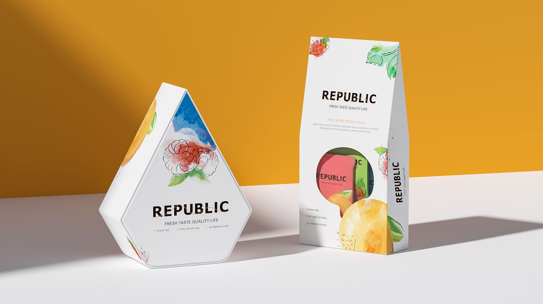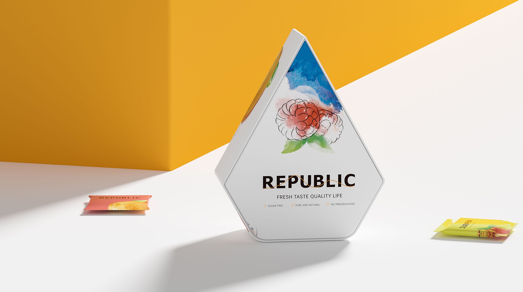 REPUBLIC水果味巧克力包裝設計以簡約及時尚的設計風格對產品進行品牌包裝,區別市面上傳統的濃郁厚重的設計風格,以水果結合水彩的表現手法,打造年輕化的產品體驗,為品牌再在消費市場帶來耳目一新的視覺感官體驗。