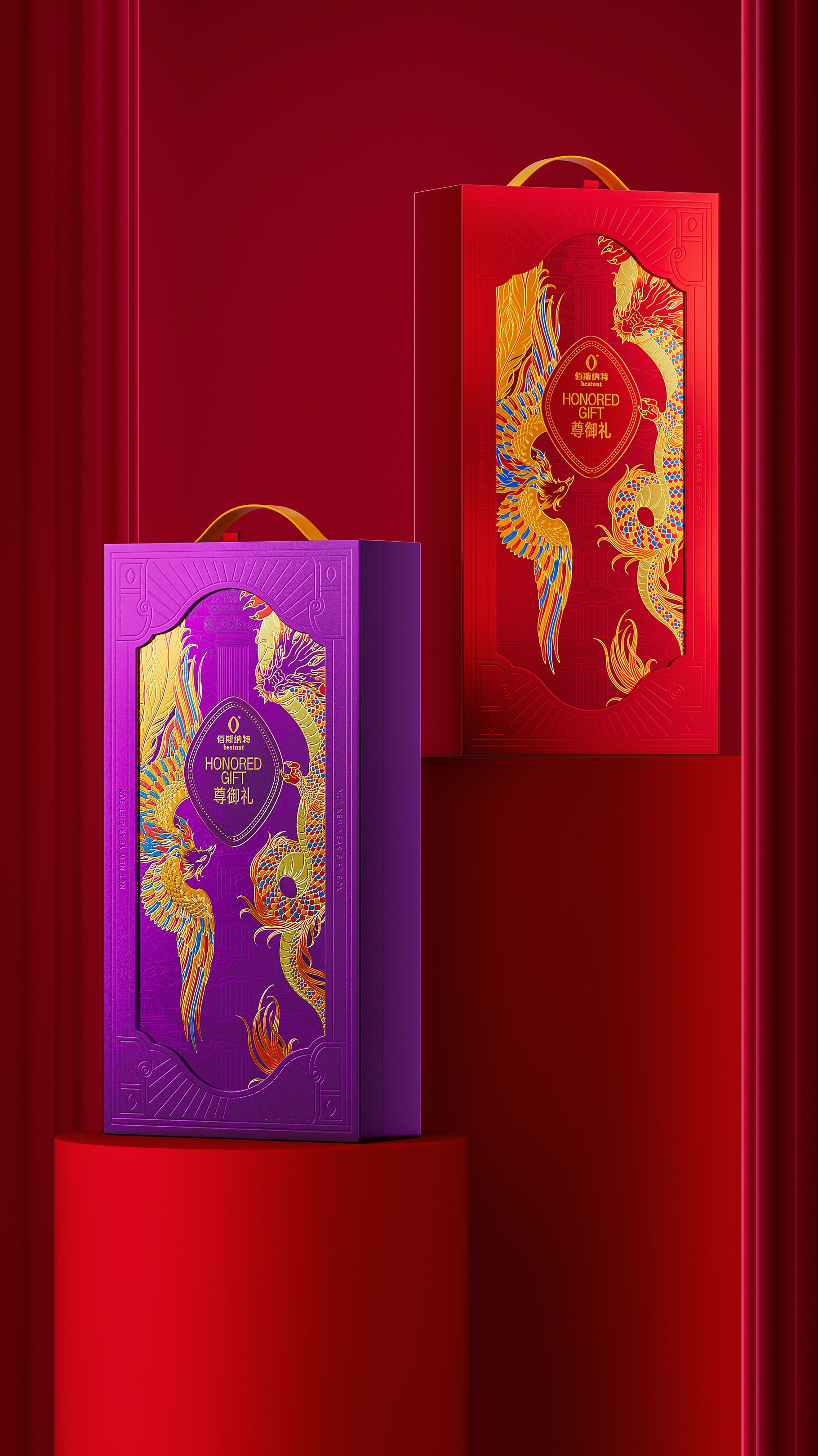 以紅、紫金色為主色調。紅色是新年的傳統色彩,代表著喜慶、熱情與活力,完美契合新年的歡樂氛圍。紫金色則象征著高貴與奢華,在古代常為皇室所用。將這兩種顏色相互搭配,禮盒主體以濃郁的紅色為底色,紫金色的主符號以及裝飾線條在其上熠熠生輝。比如,在禮盒的邊緣,用細膩的紫金色線條勾勒,既能強化禮盒的輪廓,又增添了一份精致感;在圖案的細節處,如龍鳳的鱗片、羽毛等部位,采用紫金色的燙金工藝,使其在紅色背景的襯托下,顯得更加華麗奪目,從視覺上全方位展現出尊貴與奢華。